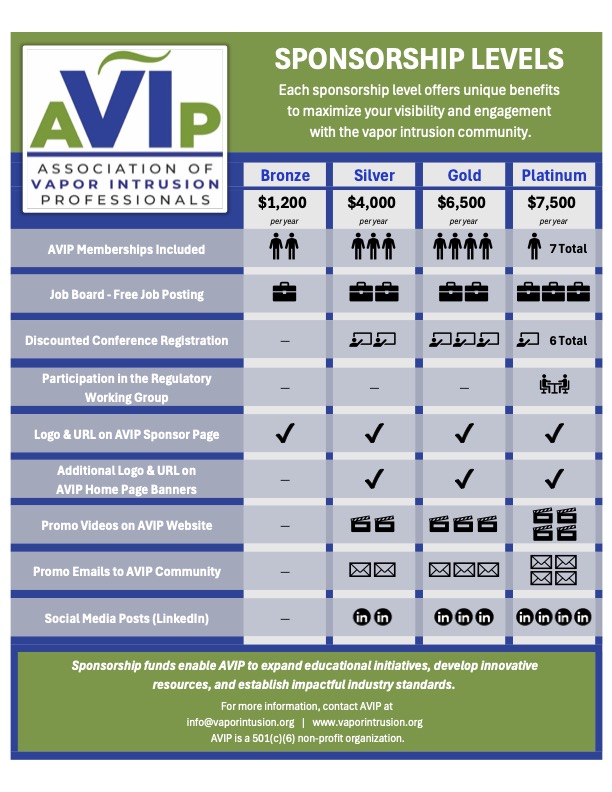 Sponsorship is vital as it directly impacts our members and the industry. The dedicated funds received enable us to expand educational initiatives, develop innovative resources, and establish impactful industry standards. Your support plays a pivotal role in fostering growth, knowledge-sharing, and sustainability within the Vapor Intrusion community.